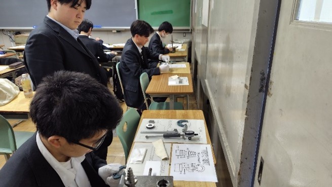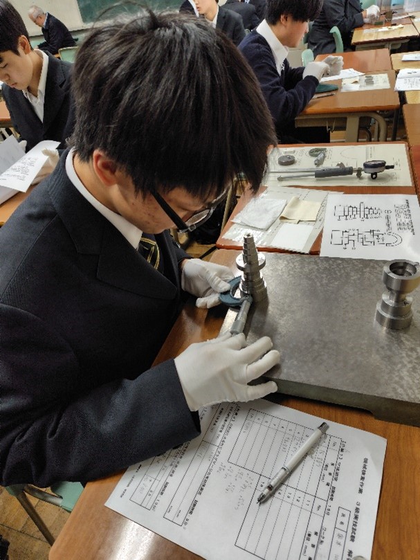 本年も大阪府職業能力開発協会のご協力のもと、ものづくりマイスターの松原博之氏を講師として招き、本校機械系生徒19名に対して、技能検定3級機械検査作業の学科・実技講習を行っていただいています。